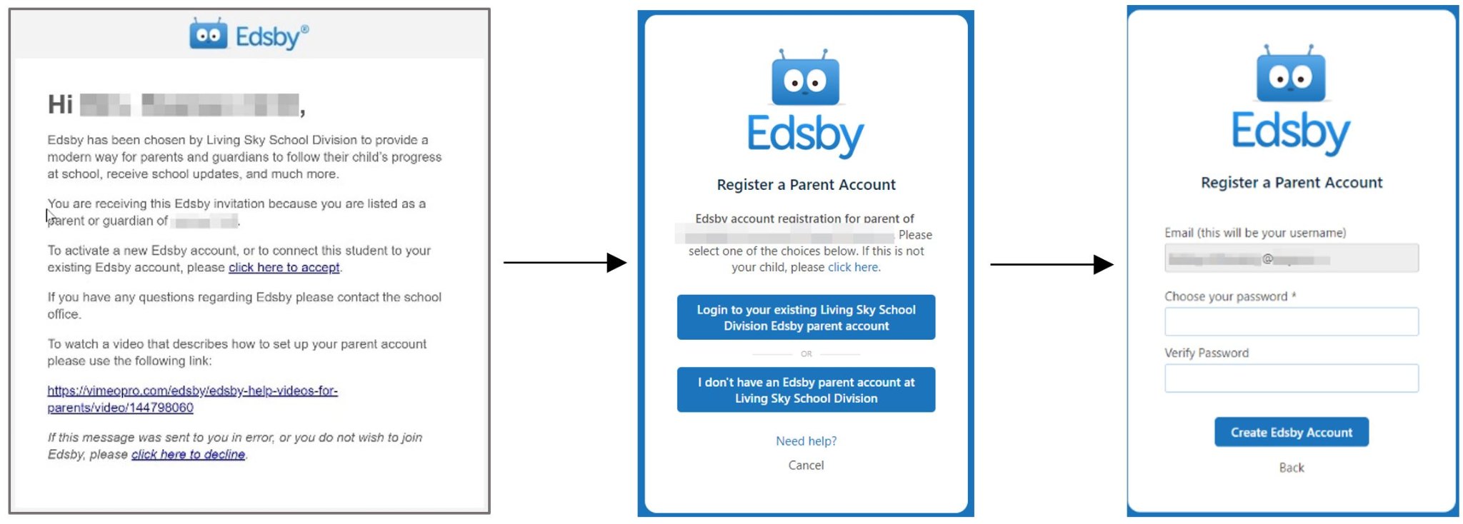 Click the link to accept the invite.  The browser will direct you to a new screen.  If you haven’t already created an account, click the ‘I don’t have an Edsby parent account at Living Sky School Division’ button.